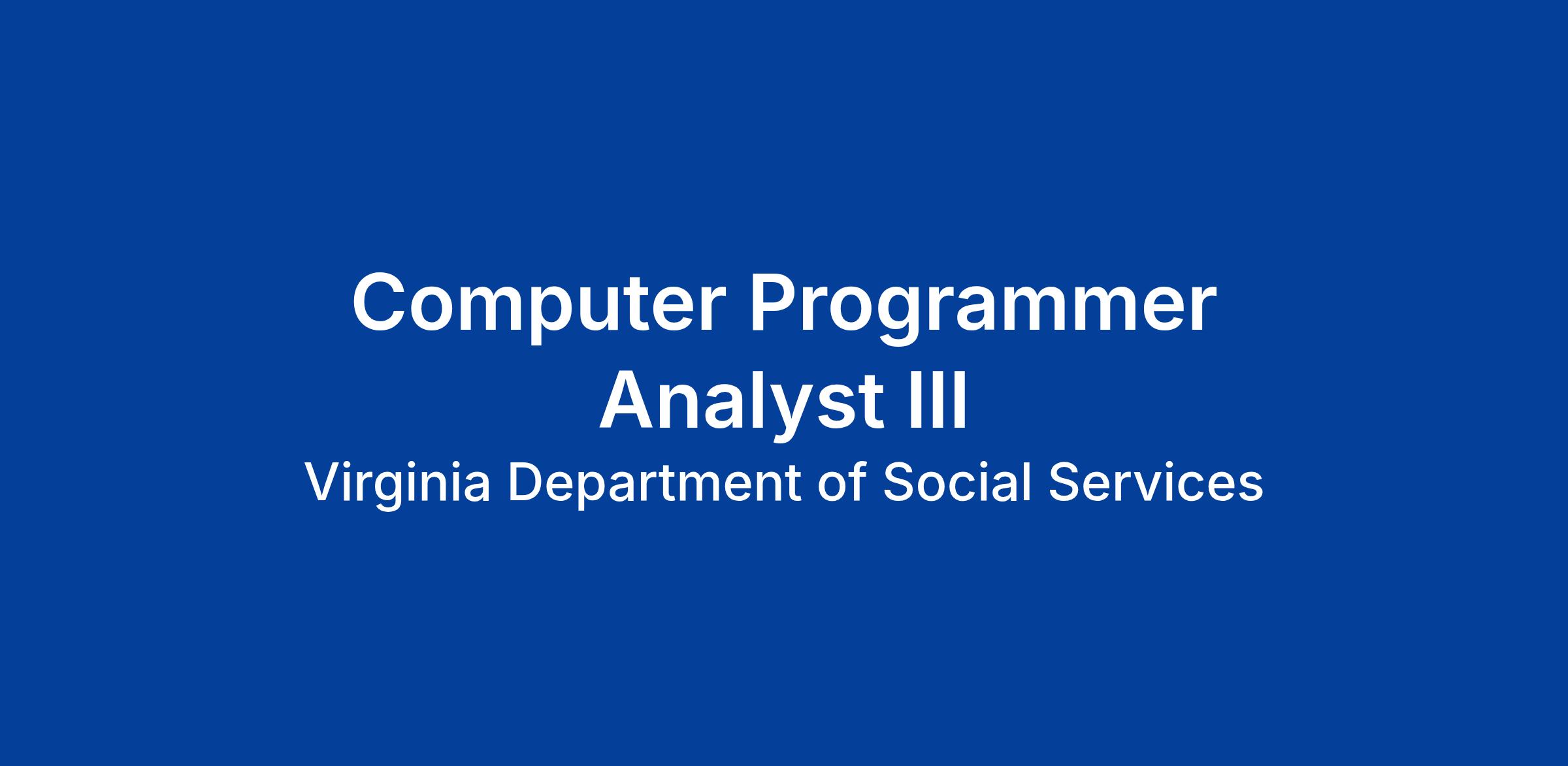 DescriptionThe City of Alexandria is bordered by Washington D.C. and the Potomac River, Arlington and Fairfax counties, and Maryland. The small city has a cosmopolitan feel with 150,000 people living within its 15.75 square miles. At the Department of Community and Human Services, we provide essential safety net services to help city residents enjoy a sense of well-being, safety and self-sufficiency. Our behavioral health programs provide compassionate services that support self-determination and recovery. The beauty of our diverse and resilient people and our commitment to race and social equity, coupled with a historic district dating to 1749, charming waterfront, vibrant arts community and unique places for foodies and shopping, make the City of Alexandria a uniquely wonderful place to live, work and play. We invite all qualified candidates to learn more and apply for our Computer Programmer Analyst III position.