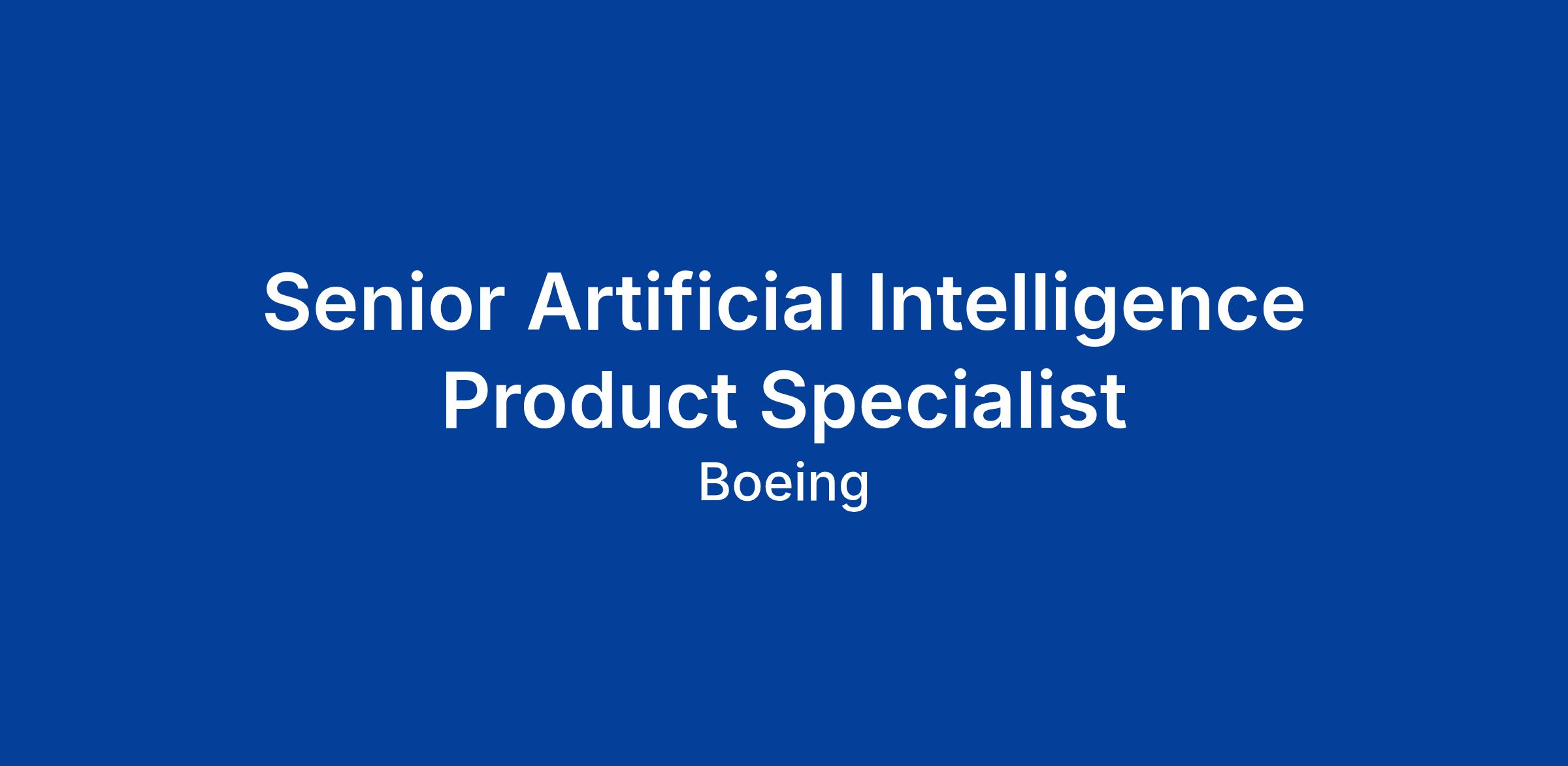 The Boeing CompanyThe Boeing Company is currently seeking a Senior Artificial Intelligence Product Specialist to join the team in Mesa, AZ; Seattle, WA; Renton, WA; Everett, WA; Plano, TX; San Antonio, TX; Berkeley, MO; Hazelwood, MO; Saint Charles, MO; or Miami, FL.